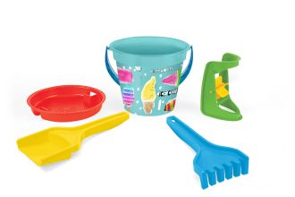 Набір доступний у двох кольорових варіантах і включає: лопату, формочку для піску, кораблик та відро 3,4 л. Зображення нанесене на відерце за допомогою сучасної технології IML (In-Mould Labelling), що робить їх виключно довговічними, навіть при тривалому контакті з водою та піском.
