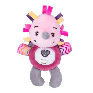 Іграшка має світлові та звукові ефекти, а саме відтворює 16 приємних мелодій. Їжачок сіро-рожевого кольору виготовлений із текстилю та пластику.